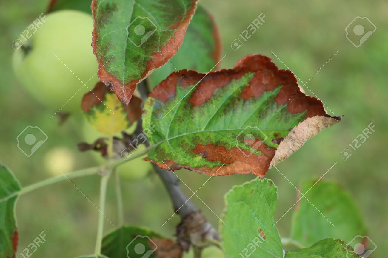 Apple Tree Leaves With Brown Spots And Edges Defromations Damaged By Infection Disease In The Orchard Stock Photo Picture And Royalty Free Image Image 156901112